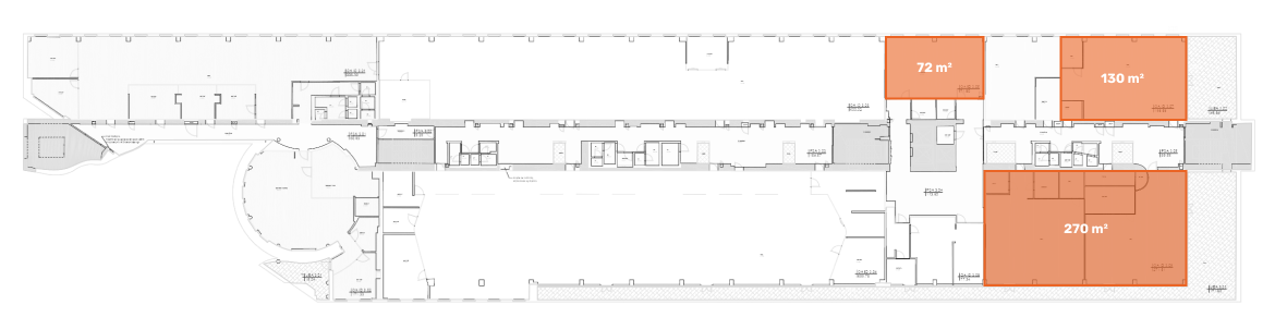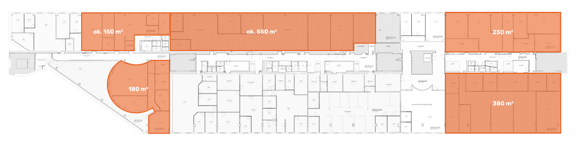 150 m2, 200 m2, 300 m2, 500 m2, 700 m2, 1400 m2, 2000 m2, 3000 m2, oraz ponad 400 miejsc parkingowych.